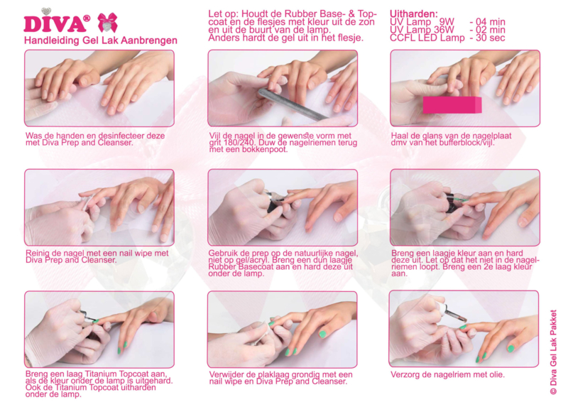 - Breng een dunne laag Diva base coat aan en trek deze goed over de top van de nagel. Laat deze 2 minuten onder een 36 Watt Lamp of 30 seconden onder een CCFL/Led lamp uitharden. Zorg ervoor dat het product niet in de nagelriem loopt. Dit voorkomt het loslaten van de gellak ook wel lifting genoemd. Gebeurt dit wel haal dan met een woodstick de Gellak weg.